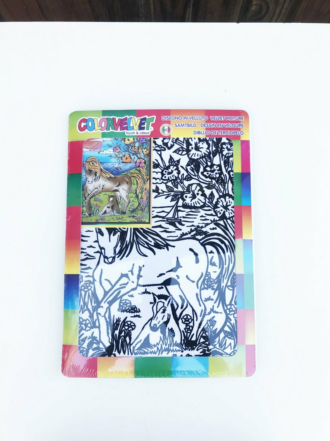 Dibujo de un caballo de tamaño 21 x 29,7 cm con 12 rotuladores para colorear.
