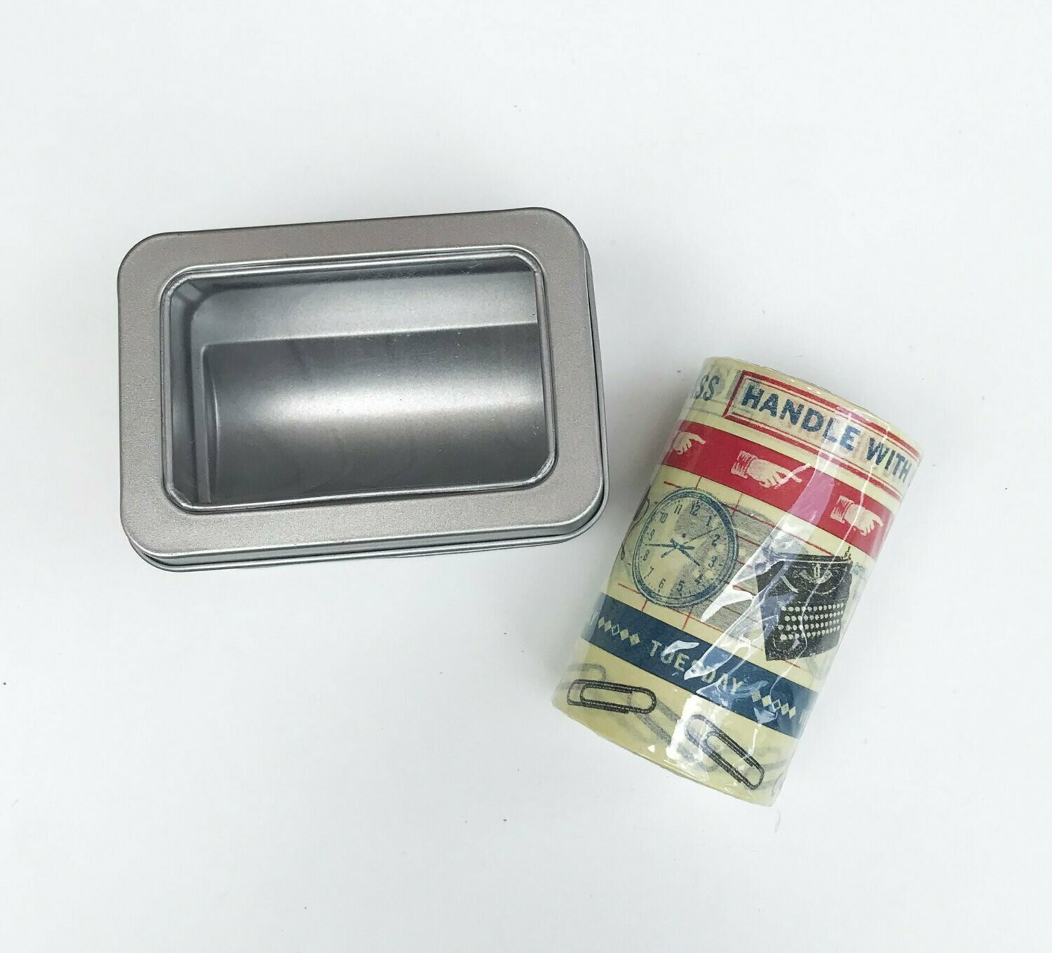 Conjunto de rollos de washi tape estampados con motivos vintage de oficina, en caja metálica.